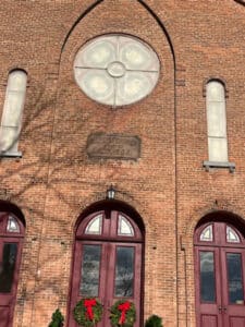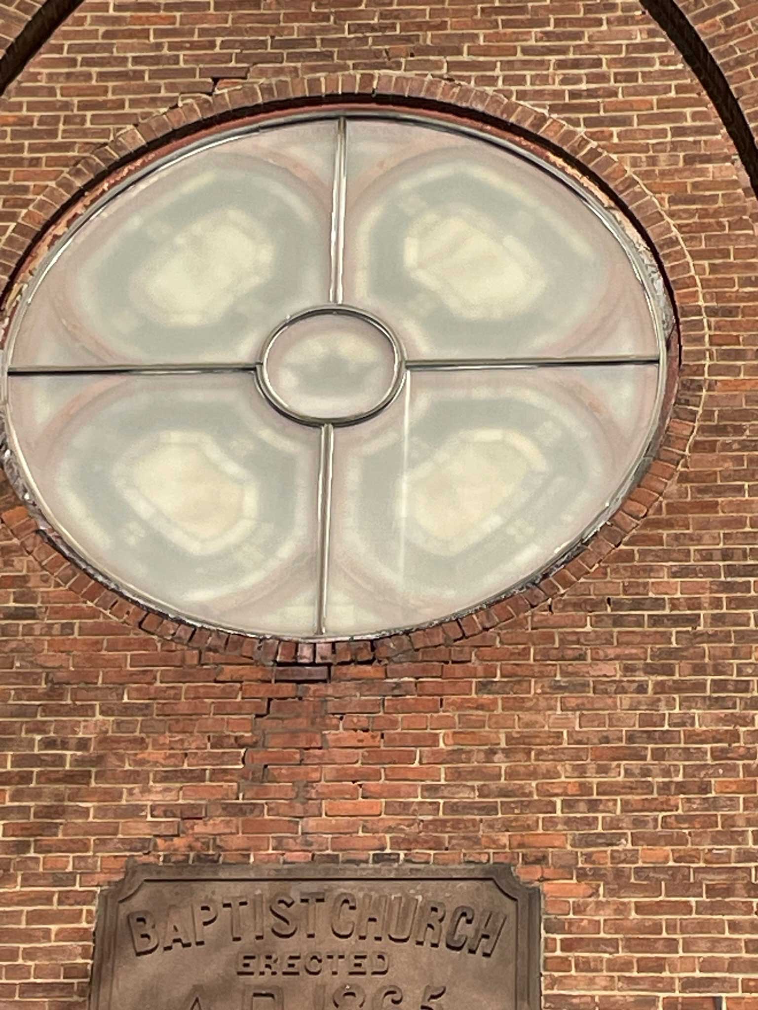 Time and the upstate New York elements have taken their toll. The delicate lead structural supports of the window are weakening and breaking putting the glass at risk of permanent damage. The brick and surrounding structure of the stained glass window is also deteriorating and crumbling.